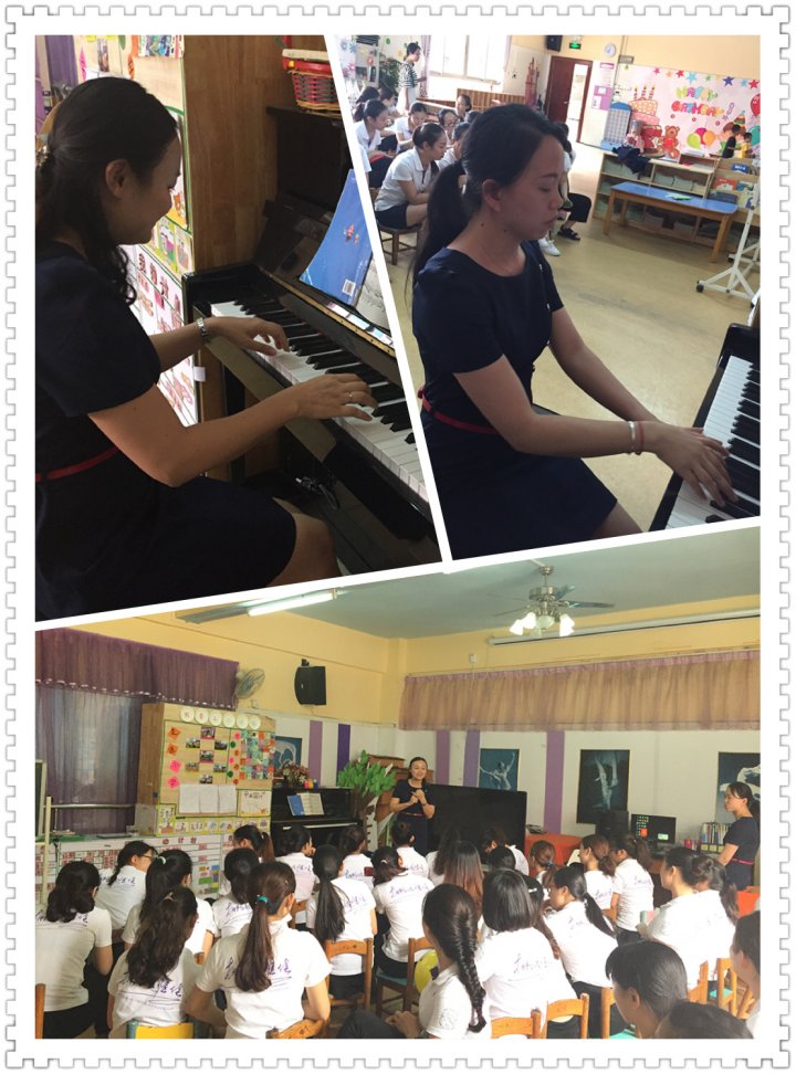 接著是中小班的教師進(jìn)行演奏,大部分的老師自彈自唱,樂曲演奏規(guī)范、流暢完整,能正確把握節(jié)奏、力度、速度及音色,具有較強(qiáng)的樂感和表現(xiàn)力;