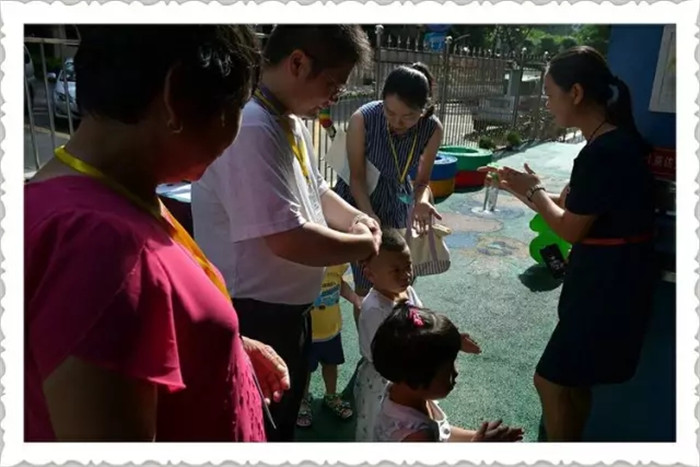 8點(diǎn)40分,我們的家長準(zhǔn)時(shí)帶著寶寶入園簽到、消毒,同時(shí)我們發(fā)放參觀證,進(jìn)行分組。