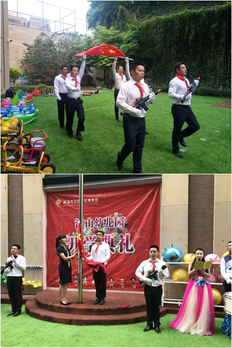 隨著音樂唱響慷慨激昂的國歌,由爸爸們擔任旗手將五星紅旗冉冉升起!
