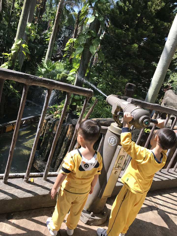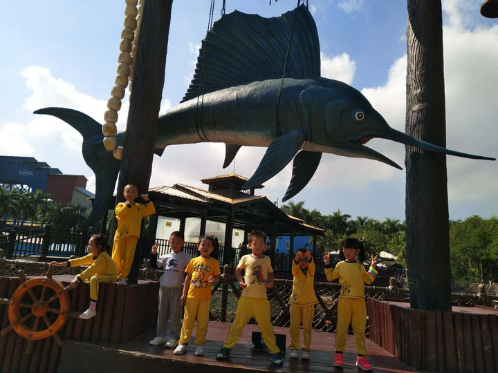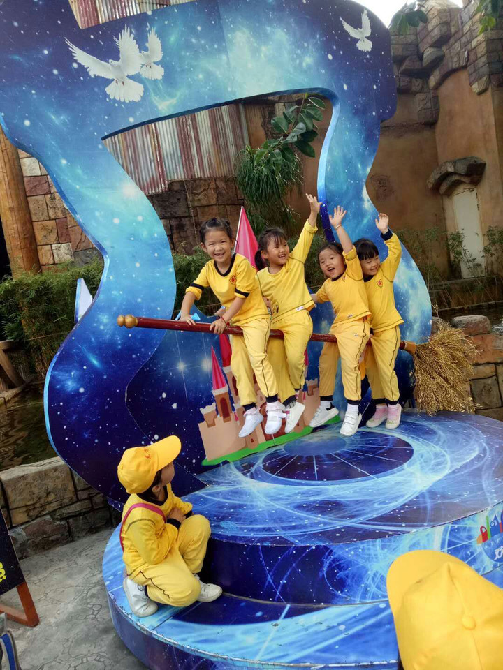 我們從主題園區(qū):西班牙廣場、魔幻城堡、冒險山、金礦鎮(zhèn)、香格里拉雪域、陽光海岸、颶風灣、歡樂時光。接著來到《幻城》、3D影院、四維電影。每個幼兒臉上充滿了好奇,他們的心情是全然不同的,看著孩子們一張張?zhí)煺娴男δ槪藭r我也被這種氛圍感染了!