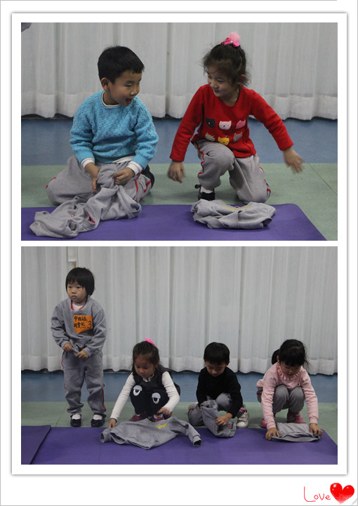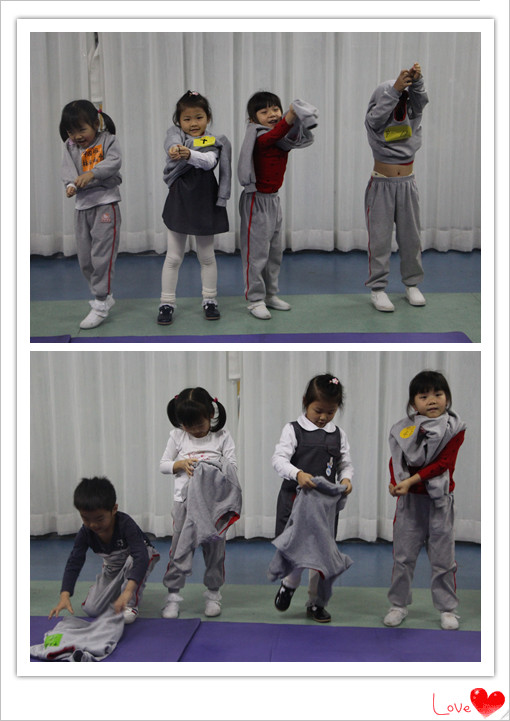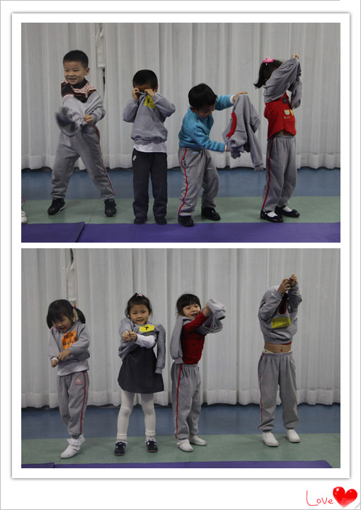 ●中班:套灰色運(yùn)動(dòng)服(套頭衣服并脫下來(lái)整理)