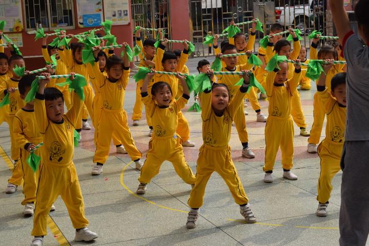 小班孩子的是動作模仿操,道具是啞鈴。啞鈴是一種能鍛煉身體肌肉力量的健身器材,運用啞鈴是讓孩子在模仿練習(xí)中鍛煉手臂的肌肉力量。小班孩子稚氣、可愛的動作和表情讓園長老師們歡聲笑語。中班孩子帶來的是《霸王鞭操》,霸王鞭是來自云南白族的一種舞蹈里最具代表性和流行最廣的器械,有著古樸幽默、歡快明朗的特點。它主要持桿以兩端隨音樂碰擊身體、膝蓋或手肘發(fā)出聲音,根據(jù)這些具有民族習(xí)俗和文化娛樂的元素融入到了早操的動作里面,打破傳統(tǒng)的風(fēng)格,給人眼前一亮。最具有特色的還是大班孩子帶來的綜合操:旗開得勝。操節(jié)活動打破了傳統(tǒng)一種器械的固化模式,利用了紅旗加生活中常見的生活資源(輪胎),入場創(chuàng)設(shè)了紅軍時代小小紅軍在抗戰(zhàn)時期重重被困,操節(jié)的體現(xiàn)創(chuàng)設(shè)了紅軍們奮發(fā)的抗戰(zhàn)精神,輪胎運用于體能中表現(xiàn)了紅軍們不斷抗戰(zhàn)、自強不息,經(jīng)過艱苦的奮斗,在放松環(huán)節(jié)中體現(xiàn)出紅軍們看到勝利的希望并感受勝利帶來的心情的故事情節(jié),整個故事情節(jié)貫穿整場早操,讓孩子們身同感受了紅軍的抗戰(zhàn)時代。輪胎的利用激發(fā)了孩子進行鍛煉的興趣,讓孩子自取自玩的活動中進行體能活動,大班級早操的氣勢推到了本次比賽活動高潮,雖然早操結(jié)束了,但大班孩子們卻意猶未盡。