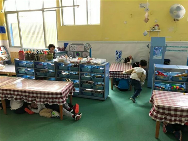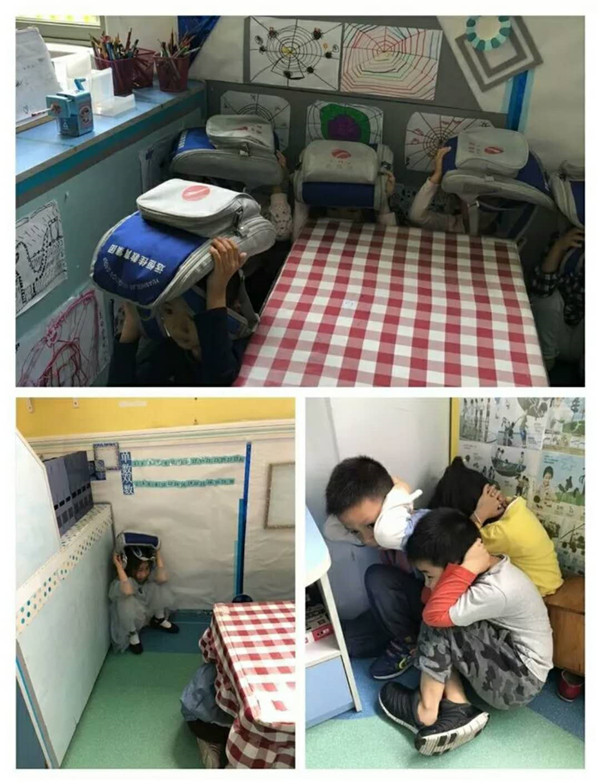 在沒有如何事先告知與準備的情況下,隨著緊急疏散的信號響起,幼速抱頭、抱后頸,身體蜷曲躲在桌下。