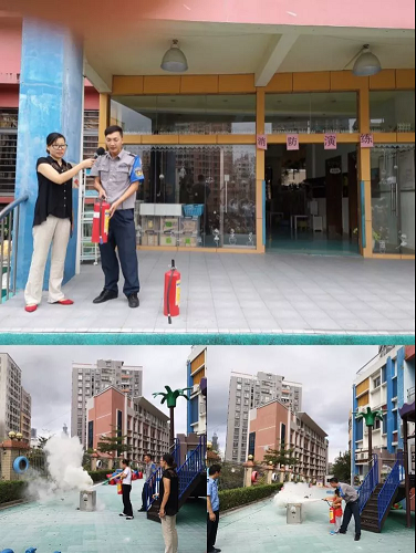 保安叔叔現(xiàn)場進行滅火器使用的講解示范,老師和孩子都參與其中,體驗正確使用滅火器。
