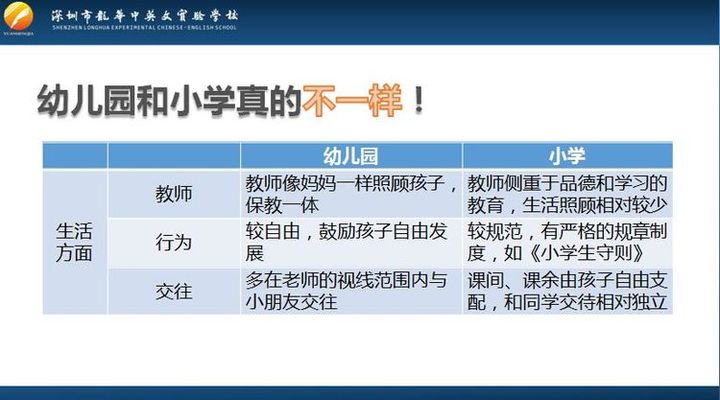 幼兒園和小學(xué)的不同之處在于學(xué)習(xí)生活環(huán)境的變化、生活內(nèi)容的變化、師生關(guān)系的變化、教學(xué)方法的變化、行為規(guī)范的變化、家長和老師期望值的變化。