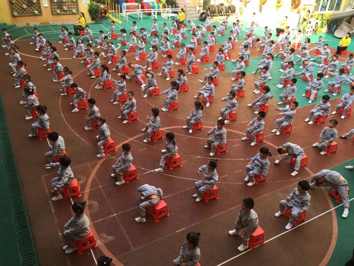 接著中班組的小朋友亮相啦!在老師的帶領(lǐng)下,他們拿著紅色的小椅子,排著整齊的隊伍,踏著有力的步伐出場了,動作整齊到位,隊形變化有致,孩子們在歡快的音樂聲中,成功展示了健康活潑、積極向上的風采。