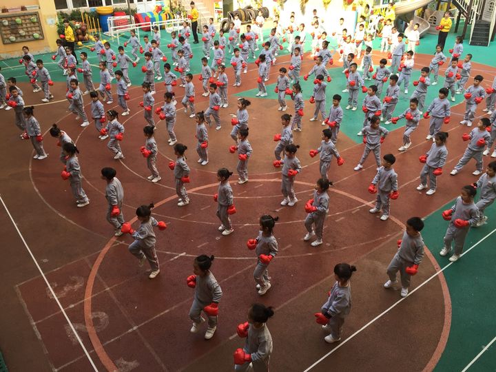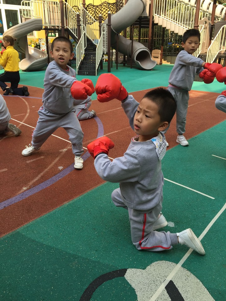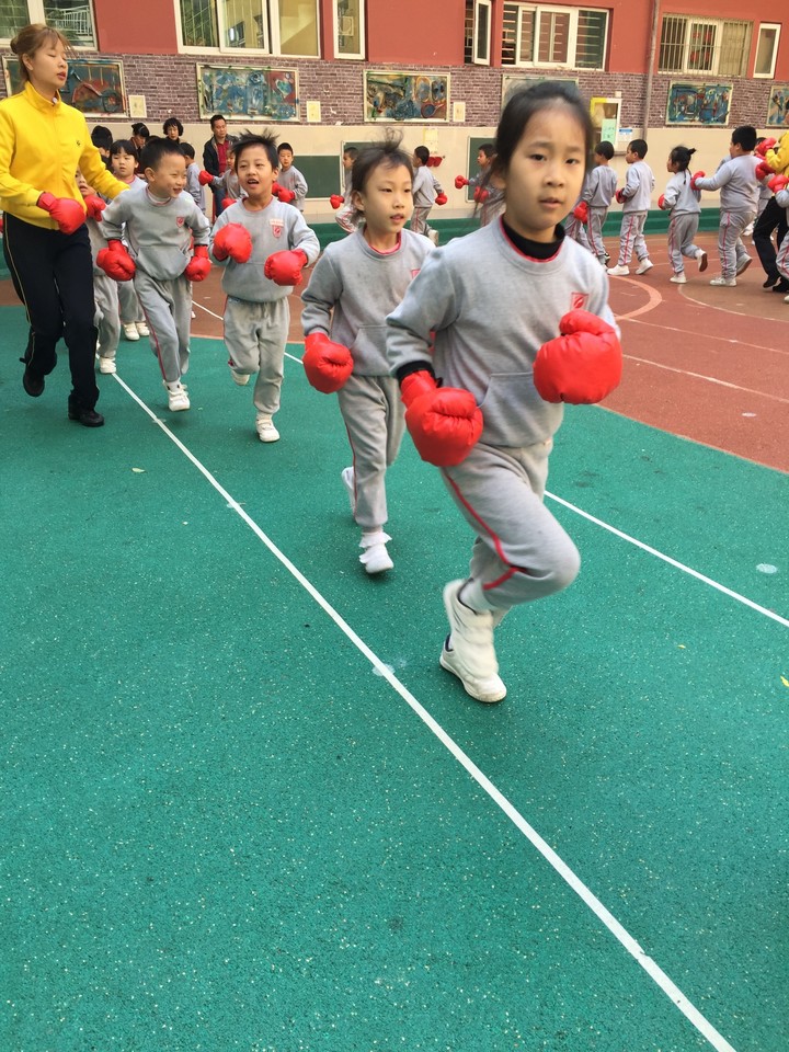 看!伴隨著歡快的音樂節(jié)奏,大班的小朋友們在老師的帶領(lǐng)下表演起了“拳擊操”,孩子們十分投入、整齊劃一地做著每一個動作;各班的教師也精神抖擻地分別站在隊前和隊后與孩子們一起做操,整個操場上洋溢著歡樂的氛圍!