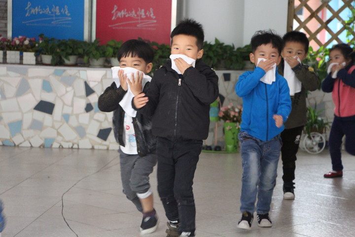 孩子們?cè)诮處煹膸ьI(lǐng)下手拿濕毛巾捂住口鼻安全逃離