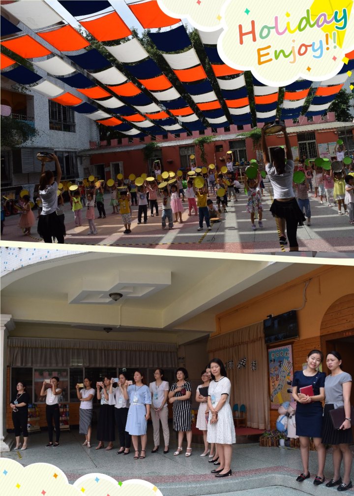 其次,公明二幼的孩子們向工作室的客人老師展現(xiàn)了我們小中大三套早操,為了給公明二幼的孩子們一個愉快、健康的童年,每天都能在精神飽滿、體力充沛的狀態(tài)中度過每一天。我們根據(jù)幼兒的年齡特點,從實際出發(fā),結(jié)合《3-6歲兒童學(xué)習(xí)與發(fā)展指南》《綱要》中對健康領(lǐng)域的目標(biāo),大膽探索早操結(jié)構(gòu)、器械的利用和音樂的選擇,將教育理念融入早操之中。主要體現(xiàn)在“一活——內(nèi)容豐富,形式多變”,“二趣——游戲多變,富有創(chuàng)意”。