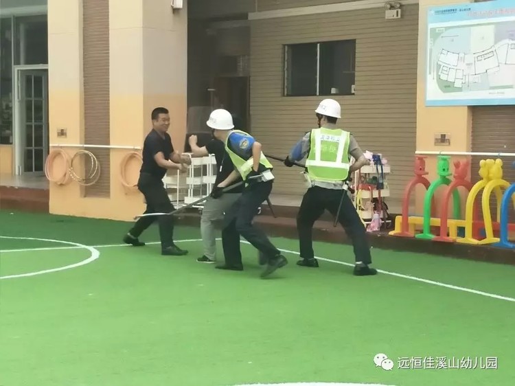 同時,幼兒園應(yīng)急小組緊急行動,按防暴應(yīng)急預(yù)案要求手持棍棒、鋼叉等,將“歹徒”圍住,與“歹徒”交涉、周旋,設(shè)法牽制“歹徒”,竭力保護幼兒安全。