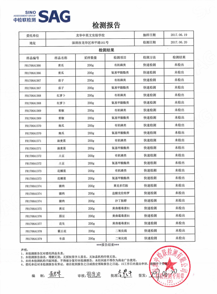 2017年06月19日,深圳市龍華區(qū)教育局委托第三方專業(yè)機(jī)構(gòu)對(duì)我校食品食材進(jìn)行抽樣檢測(cè)。深圳中檢聯(lián)檢測(cè)有限公司隨機(jī)抽查我校14種食材,對(duì)這14項(xiàng)食品進(jìn)行了24項(xiàng)專業(yè)檢測(cè),所有被檢測(cè)食材全部達(dá)標(biāo),達(dá)標(biāo)率100%。