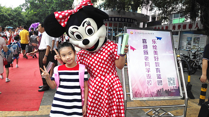 2017年9月1日晨,同學們早早背上書包,邁著輕盈的腳步去上學。來到龍華中英文實驗學校門口,咦!這么熱鬧,這么喜慶!原來是學校卜校長帶領干部、師生、家長代表一早就到學校大門口喜迎新老同學返校。還有美洋洋和Minnie為同學們贈送鉛筆、尺子、文具盒等小禮物呢!