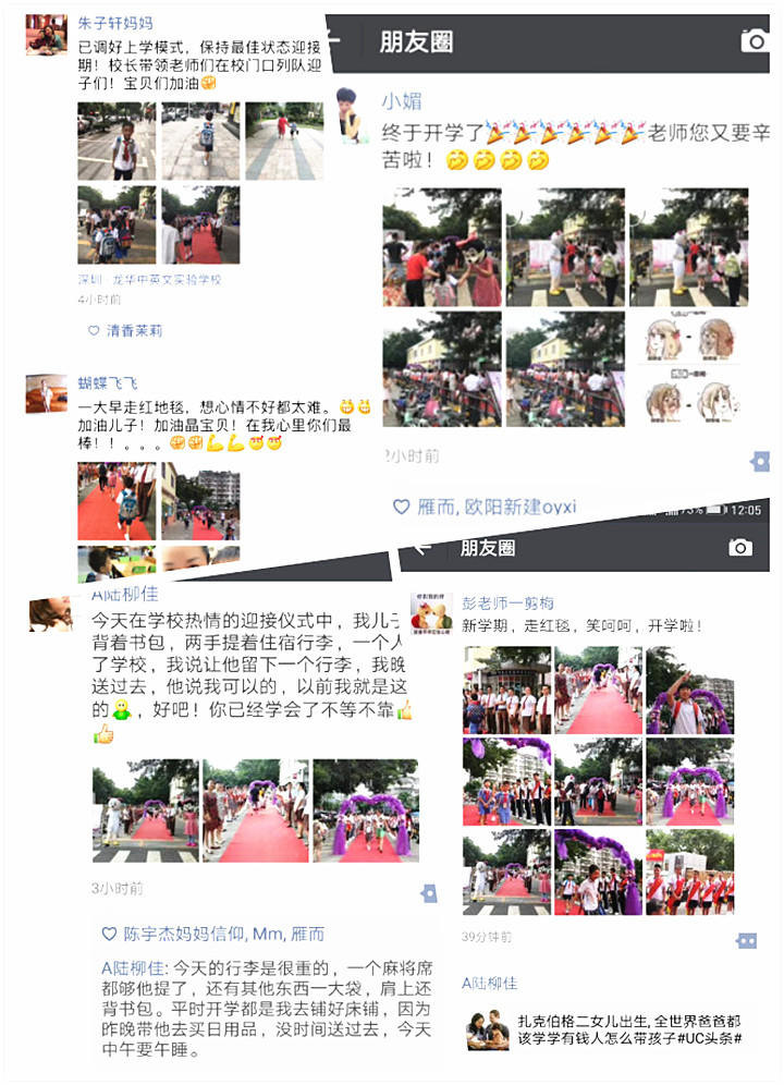 學校別具特色的入學歡迎禮,引來了第一天來校上班上學的師生、送孩子入學的家長、甚至是路人的關注,大家紛紛圍觀拍照,發(fā)微信朋友圈,QQ相冊曬照片、視頻,記錄下這難忘的情景,曬出這美麗的一刻。大家紛紛稱贊龍華中英文開學第一天愛滿校園,為學生營造了一個多彩的學習生活環(huán)境,給了孩子們開學第一天美美的好心情,為新的學期、新的學年開了個好頭!