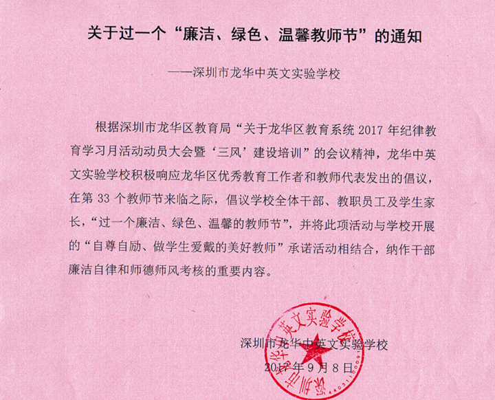 在活動現(xiàn)場,龍華中英文實(shí)驗(yàn)學(xué)校曾慧主任代表學(xué)校及全體教職工,發(fā)出了《過“廉潔、綠色、溫馨教師節(jié)”》的倡議,倡議學(xué)校全體干部、教職員工及學(xué)生家長,“過一個廉潔、綠色、溫馨的教師節(jié)”,并將此項活動與學(xué)校開展的“自尊自勵、做學(xué)生愛戴的美好教師”承諾活動相結(jié)合,做一個廉潔自律、受學(xué)生愛戴的美好教師。