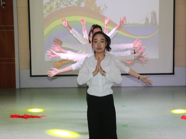 活動在一場T臺秀中拉開序幕,沒有華麗的服飾,沒有炫彩的妝容,但十多位女教師用職業(yè)裝在舉手投足間展現(xiàn)出良好的精神面貌和職業(yè)素養(yǎng),贏得了滿堂喝彩。接著,唱歌、舞蹈、輪滑、悠悠球,一個個讓人驚幸喜的節(jié)目輪番上臺,這些平時溫文爾雅,在工作中默默奉獻的老師展現(xiàn)了他們多才多藝的另一面,讓觀眾大開眼界。語文老師廖義玲的風手琴獨奏《啊朋友再見》,琴聲婉轉連綿、曲折優(yōu)美,讓觀眾體驗到意大利民歌的豪放與壯闊。體育老師陳代坤現(xiàn)場書法大鵬展翅,讓人體驗到力與美的結合。還有美術老師何倫,僅用四分鐘的時間便用彩紙折出一束"鮮花“,有百合、郁金香、玫瑰…,栩栩如生、美侖美奐。最讓人拍案叫絕的是老師們自編自演的兩個節(jié)目“雙簧”和小品“我為海選狂”,演員們表演到位、笑點頻出,整場讓人捧腹不止,眾望所歸地被評為一等獎。