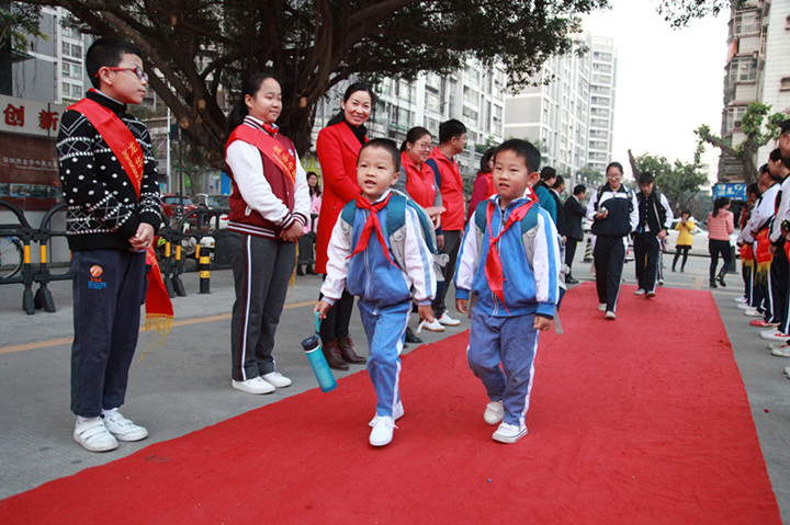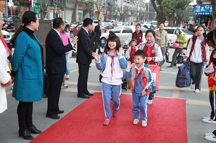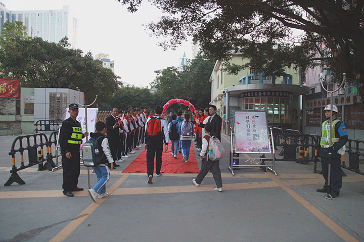2017年02月13日早6:30,當(dāng)?shù)谝晃煌瑢W(xué)迎著朝陽(yáng),帶著快樂(lè)上學(xué)的同學(xué)來(lái)到校門(mén)口時(shí),被眼前的一幕驚住了:由花門(mén)、紅毯、師生夾道、問(wèn)候、敬禮、歡聲、笑語(yǔ)、歌曲等組成的歡迎禮道,讓孩子小臉紅紅的,“老師好!同學(xué)們好”的問(wèn)候語(yǔ)情不自禁地道了出來(lái)。我們看到了來(lái)校同學(xué)發(fā)自內(nèi)心的快樂(lè)。