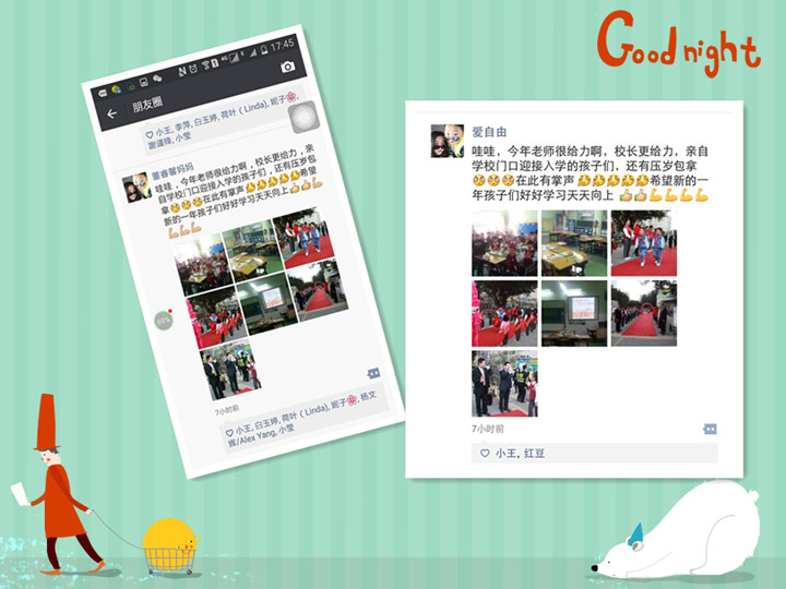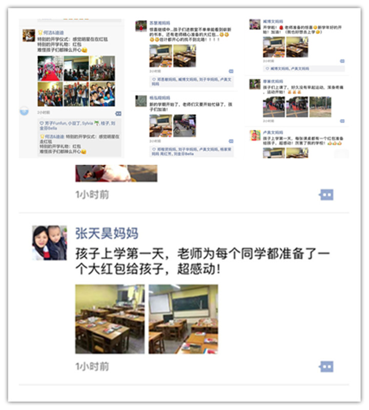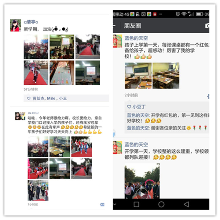 家長(zhǎng)“藍(lán)色的天空”在朋友圈中發(fā)圖片說(shuō):“孩子上學(xué)第一天,學(xué)校整得這么隆重,超感動(dòng)!厲害了我的學(xué)校!”;家長(zhǎng)“沙”發(fā)朋友圈說(shuō)“開(kāi)學(xué)啦!老師給同學(xué)們帶來(lái)了驚喜,新學(xué)年好的開(kāi)始,加油!”