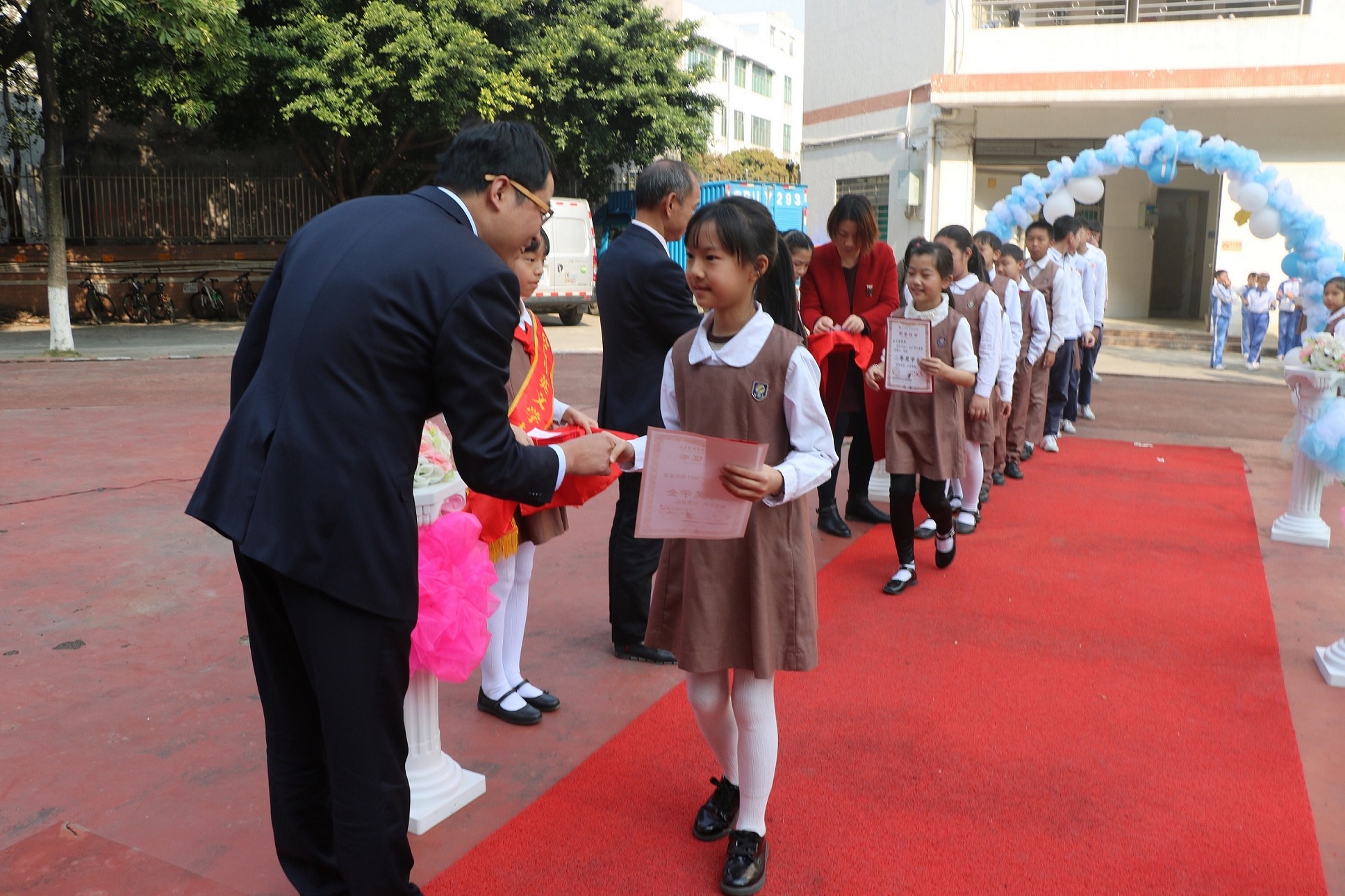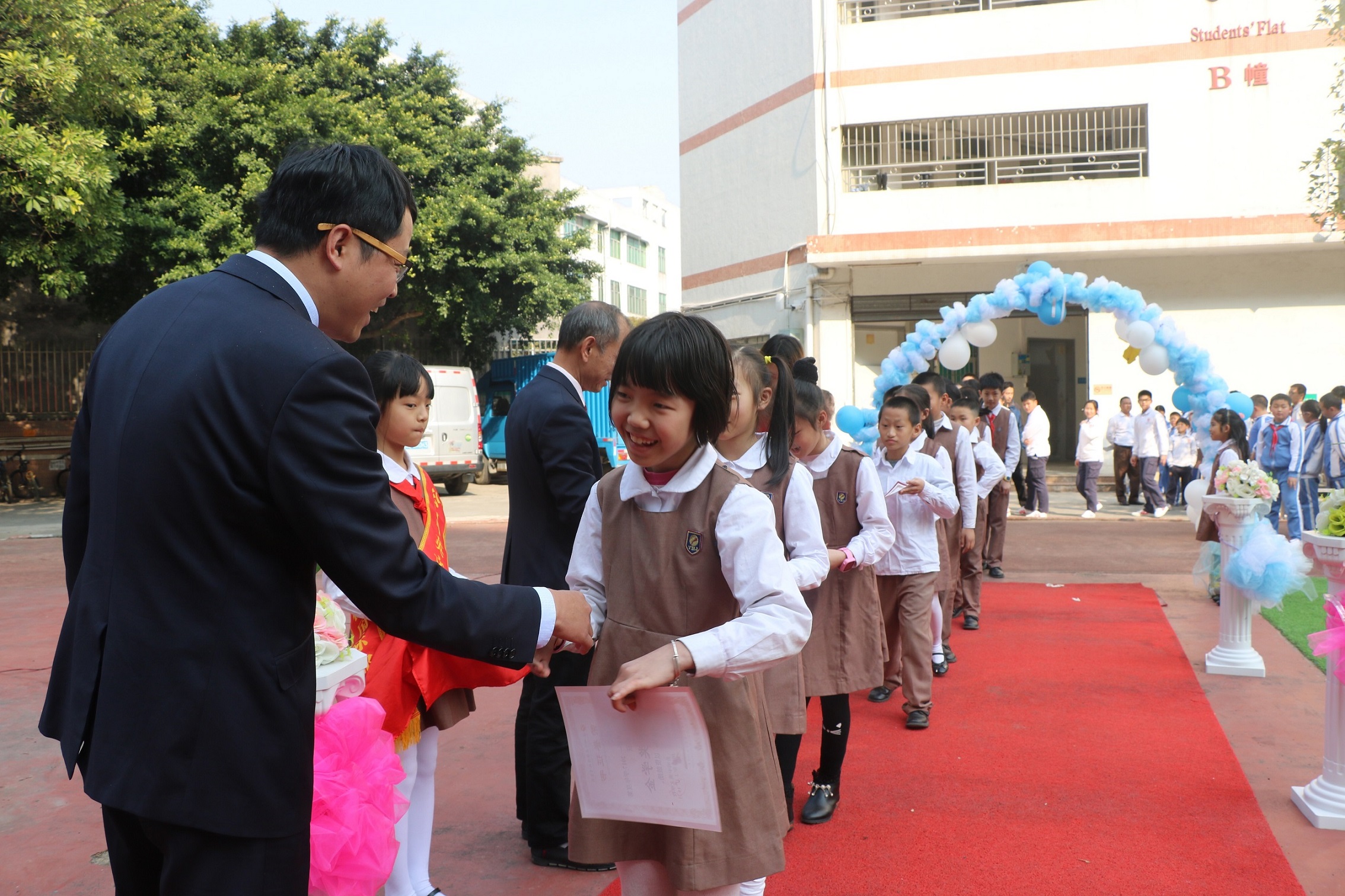 公明中英文學(xué)校學(xué)生走上紅地毯,與校長握手。