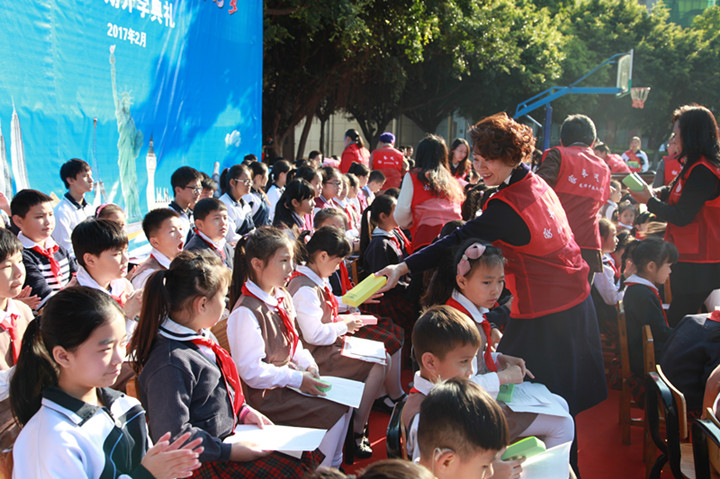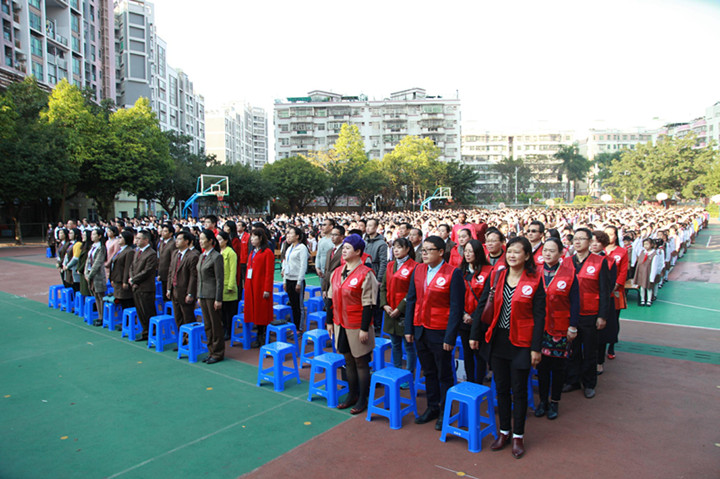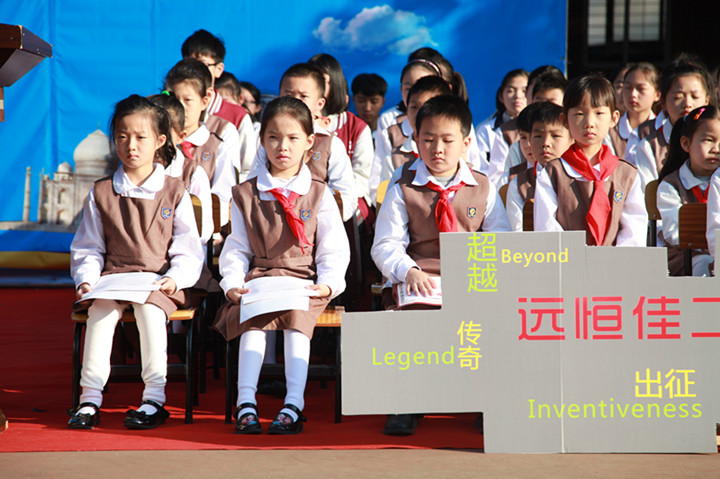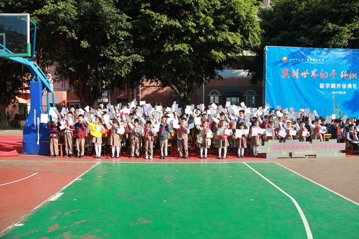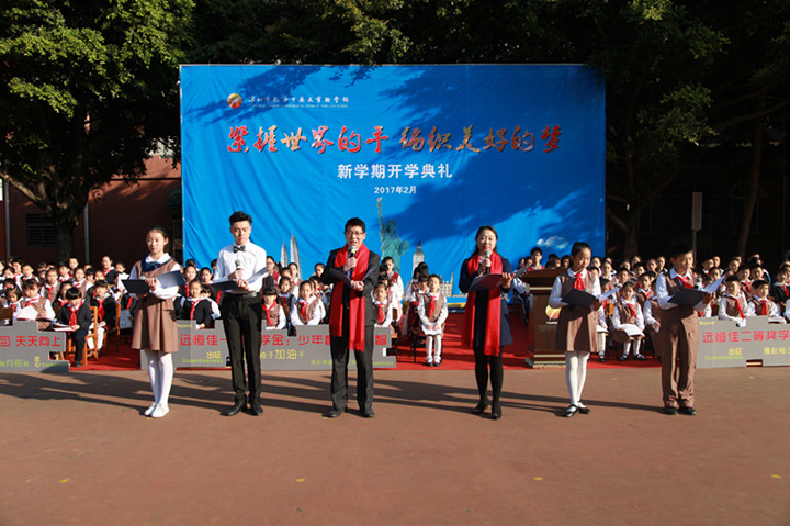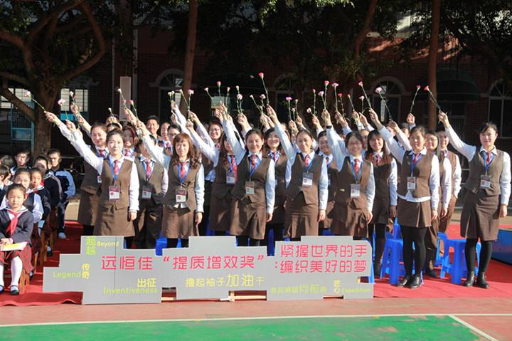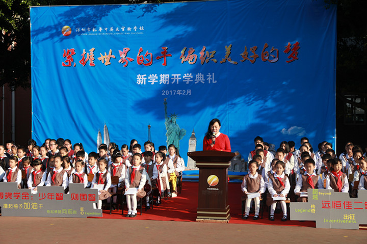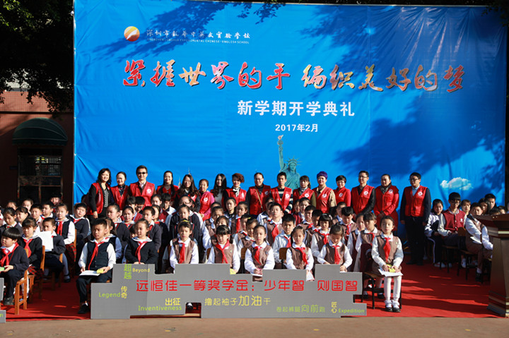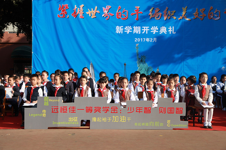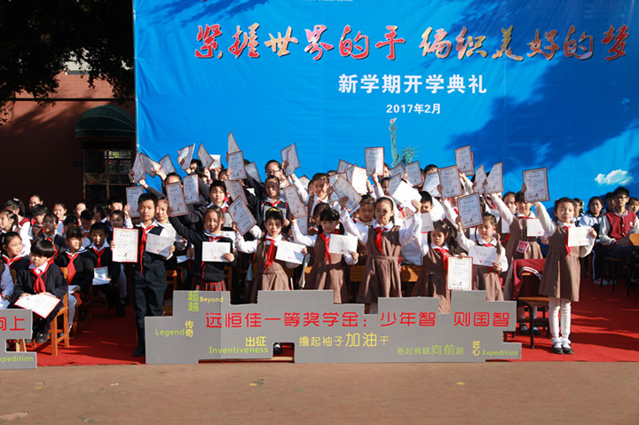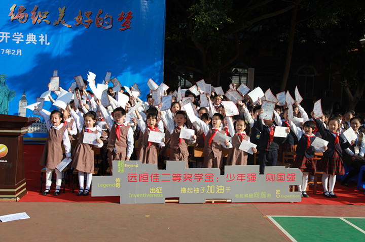2017年02月15日,深圳市龍華中英文實驗學校在運動場舉行新學期開學典禮。今春的開學典禮呈現(xiàn)出新設計、新流程、新風尚的特點?;顒幼钜俗⒛康氖亲谥飨_上的四個方陣,分別是獲得“遠恒佳獎學金”的三個學生方陣以及獲得學?!疤豳|(zhì)增效獎”的教師方陣。其中,共有182名學生獲“遠恒佳獎學金”,發(fā)放獎金三萬零五百;共有74名教職工獲學校“提質(zhì)增效獎”,發(fā)放獎金十萬元。家委會成員和家長代表為獲獎師生頒發(fā)紀念品和鮮花,獲獎師生被請到主席臺就坐,成為開學典禮的主角,充分體現(xiàn)了學校開放辦學、尊重知識、尊重人才、表彰先進的教育思想。