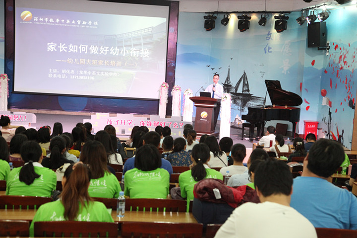 每場(chǎng)次的培訓(xùn)講座分四個(gè)主要環(huán)節(jié):一是長(zhǎng)期工作在小學(xué)教育一線的教育能手作培訓(xùn)講座;二是集團(tuán)學(xué)校建設(shè)管理方面的專家與家長(zhǎng)進(jìn)行幼小銜接經(jīng)驗(yàn)交流;第三個(gè)環(huán)節(jié)穿插在前二個(gè)環(huán)節(jié)中,利用培訓(xùn)講座間隙,由集團(tuán)親子教育導(dǎo)師與幼兒家長(zhǎng)進(jìn)行互動(dòng)。第四個(gè)環(huán)節(jié)是集團(tuán)安排專門人員參觀龍華中英文實(shí)驗(yàn)學(xué)校的校園環(huán)境、小班化、國(guó)際化、校園文化等方面的建設(shè)情況。