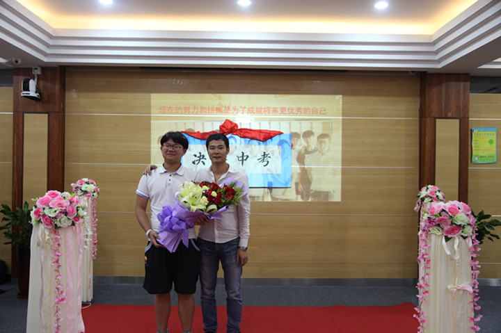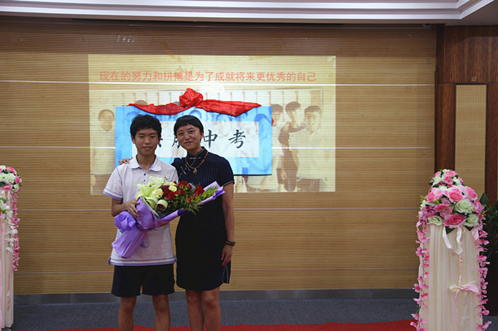 會(huì)議由李劍鋒主任主持,首先是由卜校長(zhǎng)、張主任、初三的兩位班主任、初三優(yōu)秀學(xué)生代表及其家長(zhǎng)等人鄭重地完成了“決勝中考”的揭牌儀式,擂響了中考最后沖刺50天的戰(zhàn)鼓。接著,在所有同學(xué)、老師的熱烈掌聲中,上周在龍華區(qū)二??荚囍腥〉昧藘?yōu)異成績(jī)的13名學(xué)生在家長(zhǎng)的陪同下一同走上了象征光榮和驕傲的紅地毯,并手捧鮮花合影留念,成為了在場(chǎng)所有同學(xué)的學(xué)習(xí)榜樣。