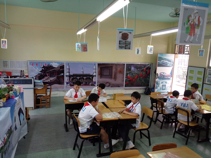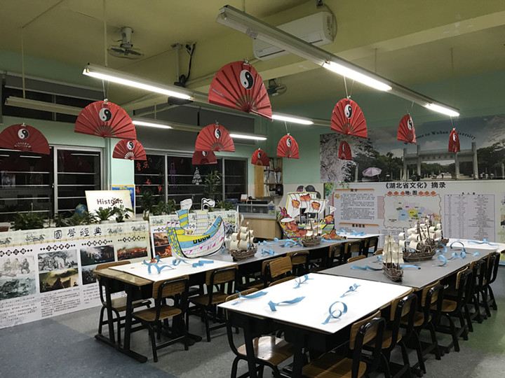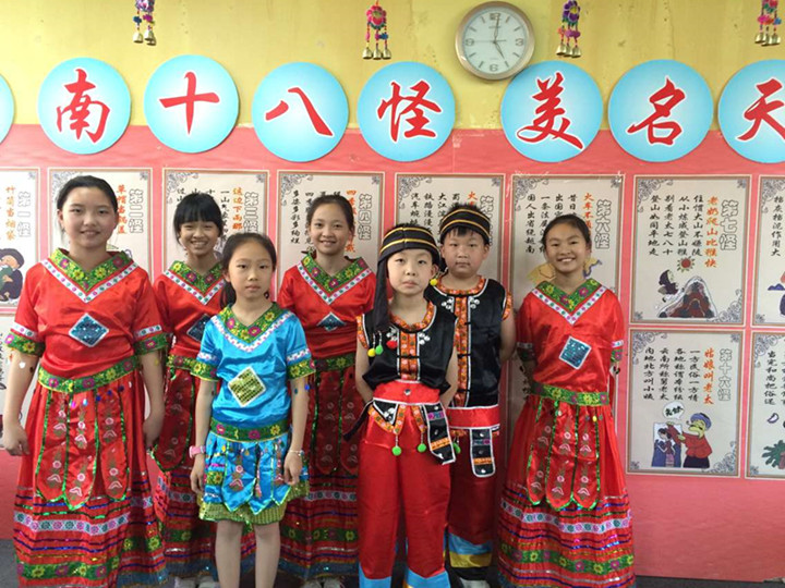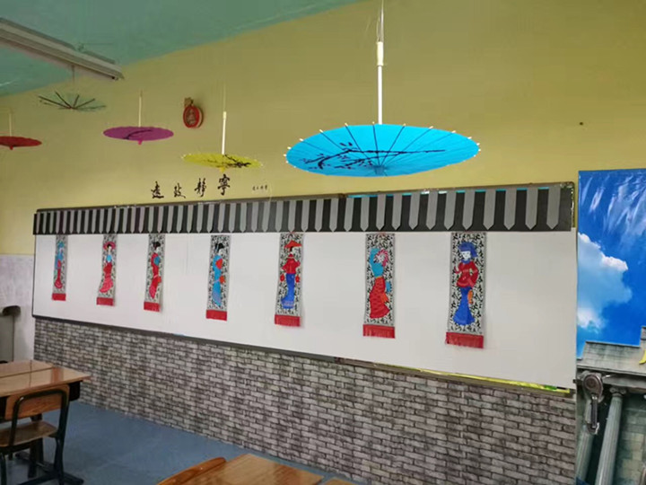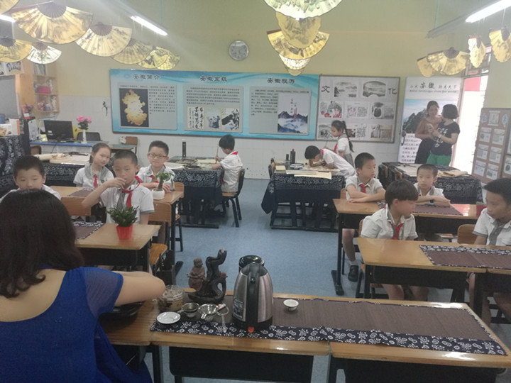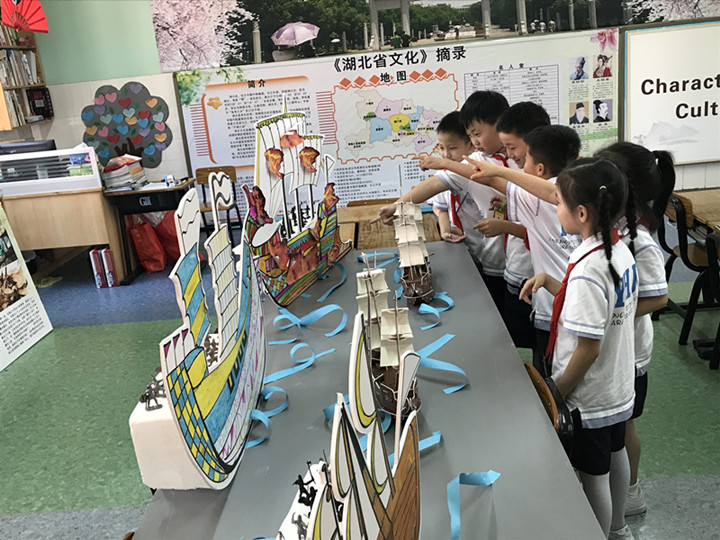 各班級的地域文化創(chuàng)設(shè)各具特色。3D班以“安徽十大名茶”為主題,以黃梅戲人物手工縮影畫為特色,輔以現(xiàn)場沏茶、彈古箏將安徽文化演繹得古色古香;1B班匠心獨(dú)運(yùn),教室內(nèi)的武漢大學(xué)、黃鶴樓、湖北省文化等造型大氣磅礴,賦予教育意義,課桌上整齊擺放的各種古代帆船、戰(zhàn)船重現(xiàn)了赤壁古戰(zhàn)場昔日的輝煌;5A班栩栩如生的“云南十八怪”圖片、惟妙惟肖的各種民族掛飾、服裝、服飾再現(xiàn)了民族風(fēng)情,七彩的懸掛整齊的風(fēng)鈴,微風(fēng)徐來,那悠悠的脆脆的銅鈴聲無不引起我們對云南昔日商貿(mào)、文化繁榮的遐想……