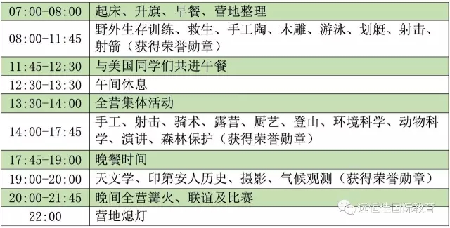 拓展新的社交圈、說一口流利口語、培養(yǎng)創(chuàng)造性思維、開闊眼界、提升領(lǐng)導(dǎo)才能、強健體魄、富有擔(dān)當(dāng)精神、掌握野外生存技能……放松自在的全英文環(huán)境,充滿善意的外國玩伴,豐富多彩的教學(xué)課程,賞心悅目的藍(lán)天碧水,除了讓你搖身變成“美國通”,還能獲得珍貴的跨國“戰(zhàn)友情”!