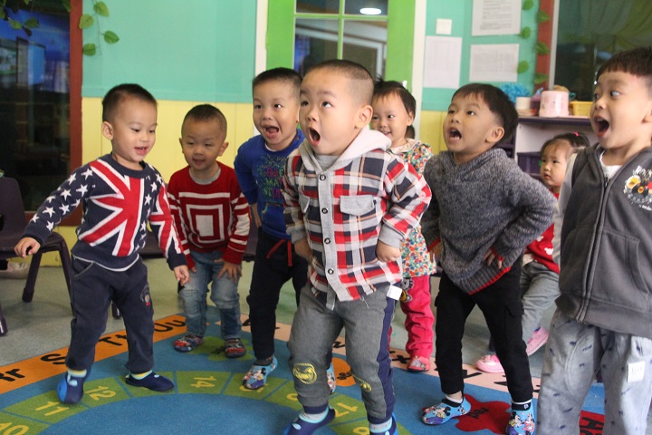 圖為早教中心的寶寶們認(rèn)真的在模仿老師的動(dòng)作