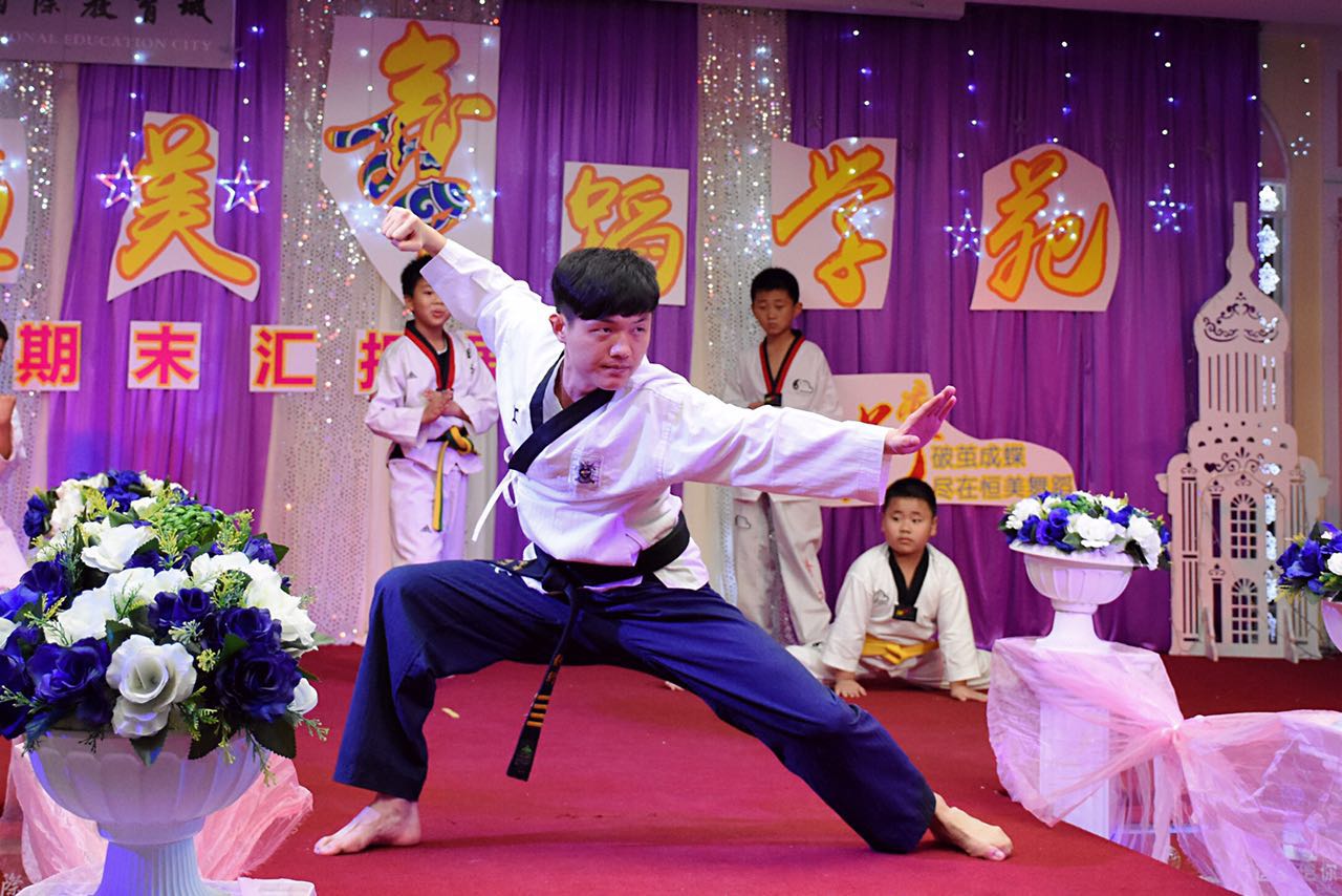 圖為跆拳道戴昂教練與同學們同臺演出