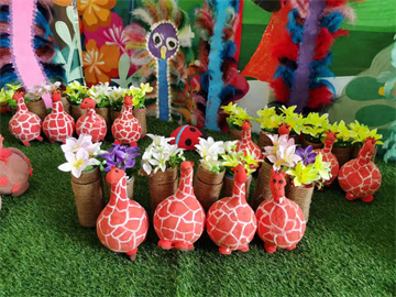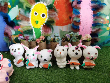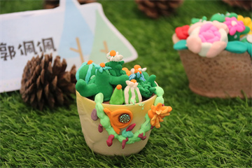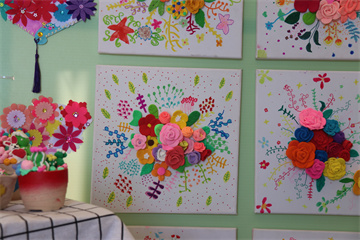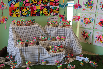 一花一世界,一樹一菩提。美麗的植物擁有治愈心靈的力量。二年級(jí)的同學(xué)圍繞“植物”主題進(jìn)行創(chuàng)作。淺綠色背景墻上展示水彩作品,繪畫作品,手工太陽(yáng)花、粘土花、花朵扇等。地板鋪草皮,搭配格子布,展示粘土多肉花盆,營(yíng)造出絢麗多彩,花香滿園的氛圍。讓我們一起在二年級(jí)同學(xué)創(chuàng)造的植物園中感受心靈的蕩滌吧!