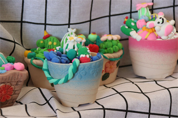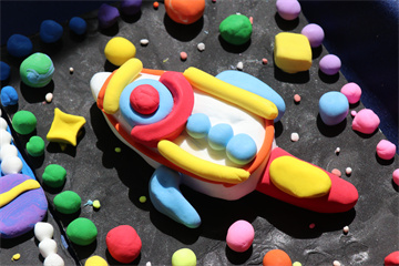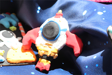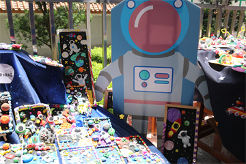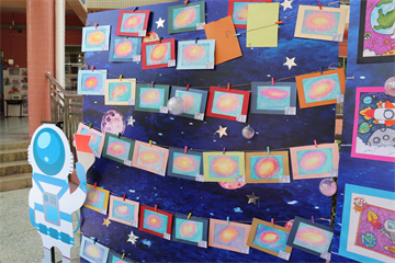 我們來(lái)自哪里?擁有無(wú)盡未解之謎的太空,總是讓孩子們心生無(wú)限的向往。這份對(duì)生命的探索和對(duì)未知世界的好奇促使五、六年級(jí)學(xué)生以“宇宙”為主題進(jìn)行了藝術(shù)創(chuàng)作。背景墻采用太空背景,搭配太空桌布和網(wǎng)格架展示六年級(jí)的外星飛碟和黑白裝飾畫,高低錯(cuò)落紙箱上則展示了五年級(jí)制作的宇宙黏土畫。讓我們跟隨五、六級(jí)大孩子們一起探索宇宙的奧秘吧!