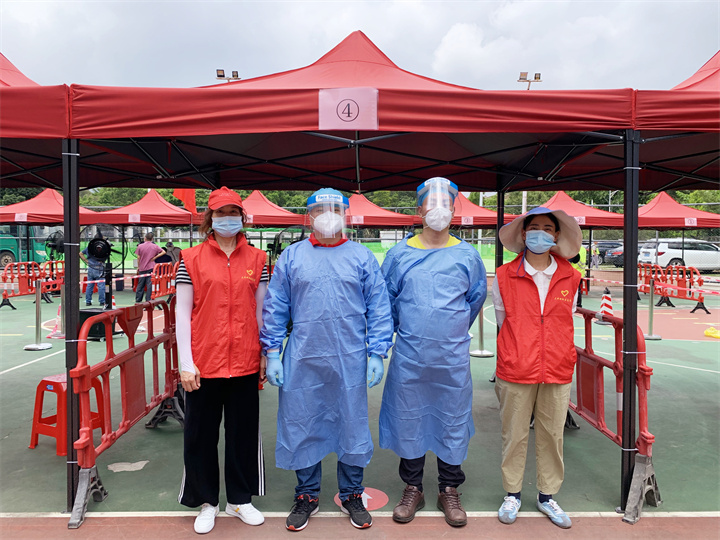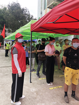 為了協(xié)助龍華區(qū)全員核酸檢測,我校5名志愿者參與了觀瀾大水田社區(qū)的志愿服務行動。大水田社區(qū)離學校較遠,路況復雜,我們每天來回大約需兩個小時。我和葉東紅同志主要負責檢測人員分流。本次檢測人員較多,需10人一組進行檢測,有一些老人和小孩兒沒有健康綠碼,我和葉東紅同志協(xié)助給他們申報并指引他們到相應區(qū)域進行檢測。