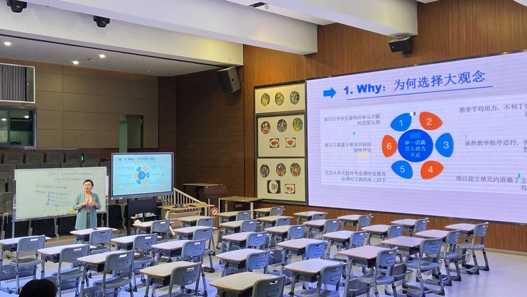 最后,長壽區(qū)英語教研員任莉娜老師作了《關(guān)于大觀念統(tǒng)領(lǐng)下單元整體教學(xué)的解讀》的專題講座。她從Why-為何選擇大觀念,What-何為英語學(xué)科大觀念,How-如何基于大觀念教學(xué)設(shè)計(jì)三個方面具體地剖析了大單元教學(xué)環(huán)境下的教學(xué)思路,技能策略以及幫助學(xué)生認(rèn)知結(jié)構(gòu)的建構(gòu),情感態(tài)度的培養(yǎng)等。