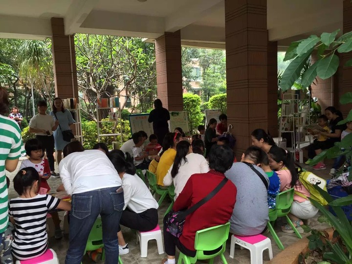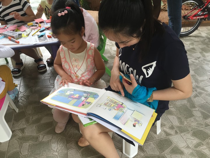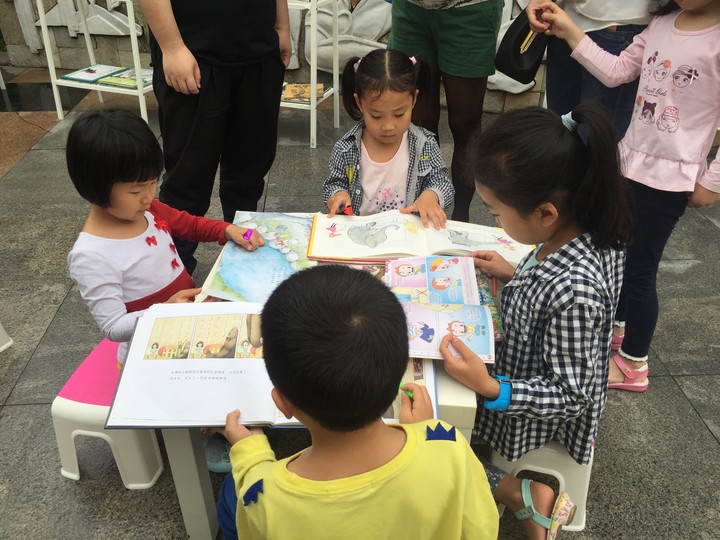 但是天公不作美,就在孩子們專心注注地與家長欣賞繪本的時候,這時候,天空中飄起了小雨,可是,雨水也澆滅不了孩子和家長們閱讀的熱情,他們豪不猶豫,把身邊的桌椅和書搬起來,帶著老師們到附近的走廊里,就這樣,孩子們又可以繼續(xù)靜下心來一起閱讀,再次進(jìn)入繪本的世界里……