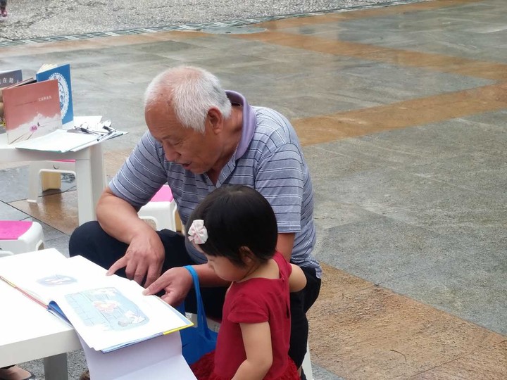 白發(fā)爺爺拿著繪本給小孫女講故事