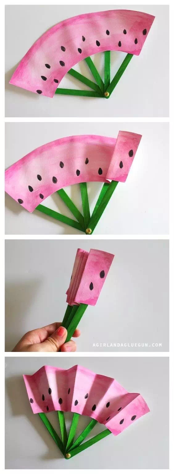 水果紙扇甜甜而來(lái)。做好的西瓜紙扇、橘子紙扇。也可以把你喜歡的水果做出來(lái)哦。有想咬一口的沖動(dòng)!