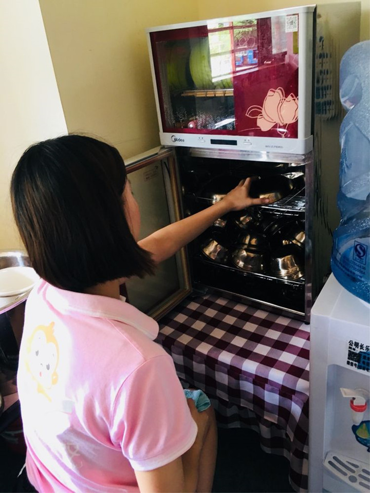 瞧,我們的老師正為寶貝們消毒毛巾呢!